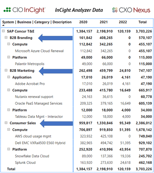This month we feature an example of how IT, Finance and Procurement leadership identified a wide variety of IT spend by Business Unit (BU) in their SAP Concur T&E system by deploying CIO InCight™, the automated source of truth for all Technology Vendor Spend. The blue arrows point to BU’s purchasing technology directly, not in collaboration with the IT organization. (Note we highlight 3 anonymized BU’s below. T&E IT spend was happening in several others as well.)