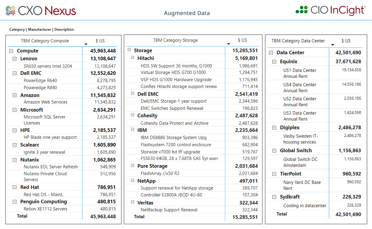 The example above highlights spend in the Compute, Storage and Data Center Categories. Derived from querying the Augmented Data created by the CIO InCight AI & ML engine, the industry standard for automated and repeatable visibility into Vendor spend. No client FTEs are required to process data and our service is compatible with all financial systems.